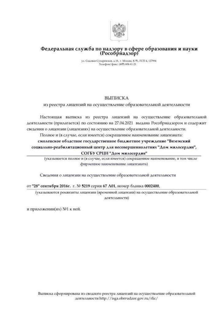 ПОЛОЖЕНИЕ о Службе дополнительного образования смоленского областного государственного бюджетного учреждения «Вяземский социально-реабилитационный центр для несовершеннолетних «Дом милосердия»